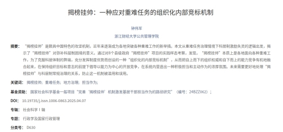摘 要 : “揭榜挂帅”是颇具中国特色的攻坚机制,近年来逐渐成为各地突破各种重难工作的新举措。本文从重难任务治理情境下科层制激励失灵的逻辑出发,揭示了“揭榜挂帅”对弥补科层制困境的意义。通过对8个县级政府“揭榜挂帅”项目的实践样态考察,发现,“揭榜挂帅”本质上是各地面向各种重难工作,为了克服科层体制的弊端,充分发挥制度优势而创设的一种“组织化的内部竞标机制”,从而把自上而下的组织权威和自下而上的能力竞争有机地融合起来,在保持组织目标和意志的前提下倡导以能力为中心的开放竞争,在系统内营造出一种积极担当和主动作为的浓厚氛围。未来需要更好地处理“揭榜挂帅”与科层制常规治理的关系,防止这一机制被滥用和误用。