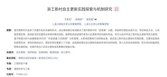 公司城市管理系教师王笑言副教授撰写的论文《浙工新村自主更新实践探索与机制研究 》被《城市规划》录用并发表。