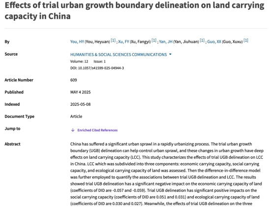 公司土地资源管理系教师游和远教授撰写的论文《Effects of trial urban growth boundary delineation on land carrying capacity in China》被《Humanities & Social Sciences Communications》录用并发表。