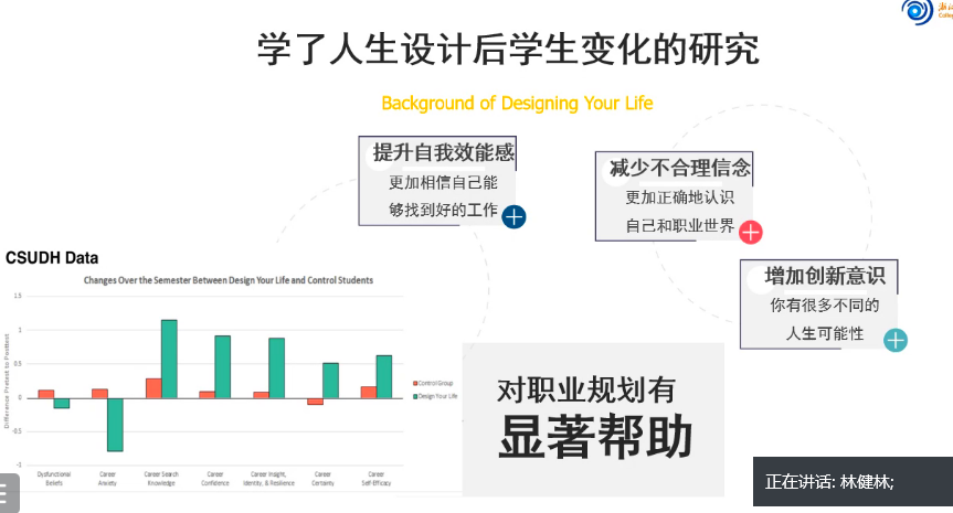 首先,主持人程晓东老师说明了此次活动的目的并和同学们讨论了职业生涯规划的重要性。在沙龙分享中,林健林老师娓娓道来,带领同学们从“人生设计法”的历史到该方法的使用和框架,旨在帮助员工们了解人生设计法的内在,从而理解职业生涯规划的本质。为了促进理解,林健林老师详细地讲解了一般职业规划思维与人生设计思维的区别,图标结合向同学们清晰明了地展示了人生设计法的优势。
