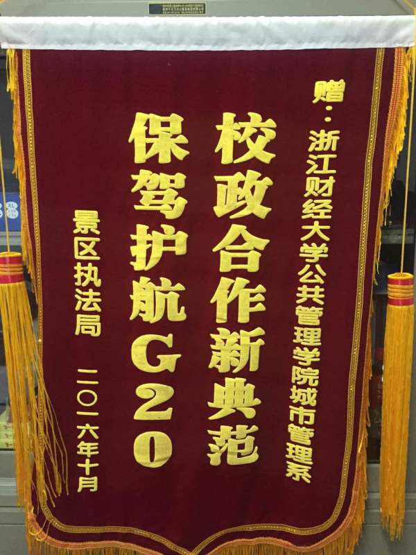 近日,杭州西湖风景名胜区管理委员会城市管理行政执法局发来感谢函并赠以锦旗,对公司参与共建G20保障辅助队伍、顺利完成G20服务保障工作表示高度赞扬和感谢。
