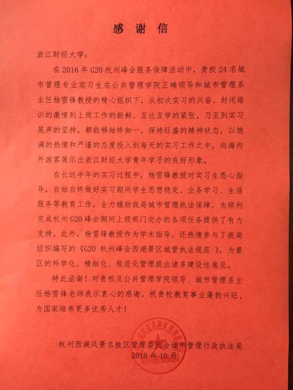 感谢信指出,公司选送的24名城市管理专业实习生以饱满的热情和严谨的态度投入到每天工作中,全力辅助城市管理执法保障,为顺利完成G20杭州峰会期间上级部门交办的各项任务提供了有力支持,向海内外游客展示了浙财学子的良好形象。执法局对公司领导的大力支持和城市管理系的精心组织表示衷心感谢,同时,也对公司教师参与组织编写《G20杭州峰会西湖景区城管执法规范》等工作给予高度评价。