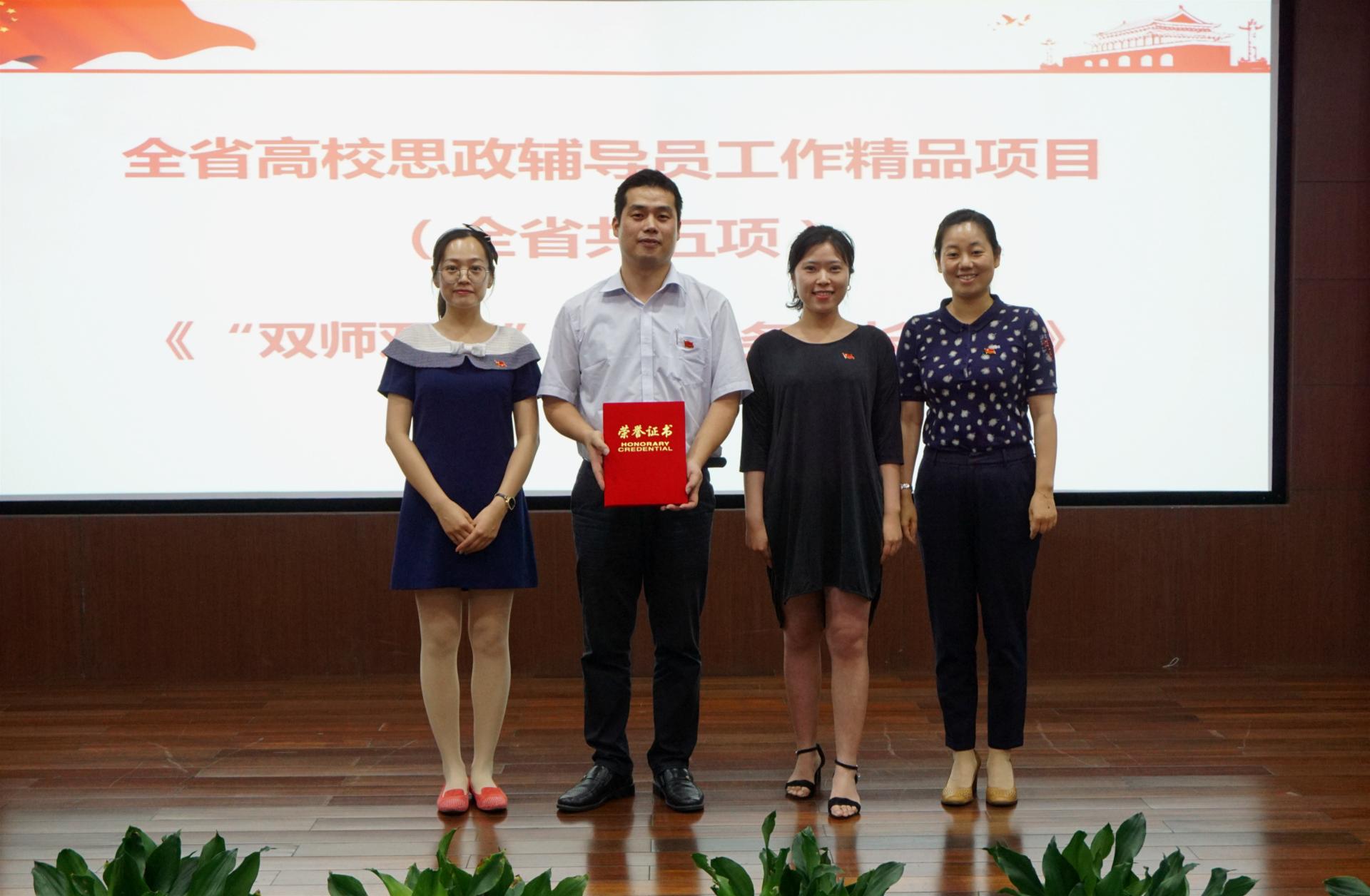 当天还进行了“双师双行”志愿服务表彰和聘任仪式,G20志愿服务团队、西湖峰会志愿服务团队等团队和个人上台接受颁奖,6位教师代表上台接受党员导师聘书。最后颁发了“两学一做”全国高校支部工作案例优秀作品、全省高校辅导员工作精品项目两个重要奖项。