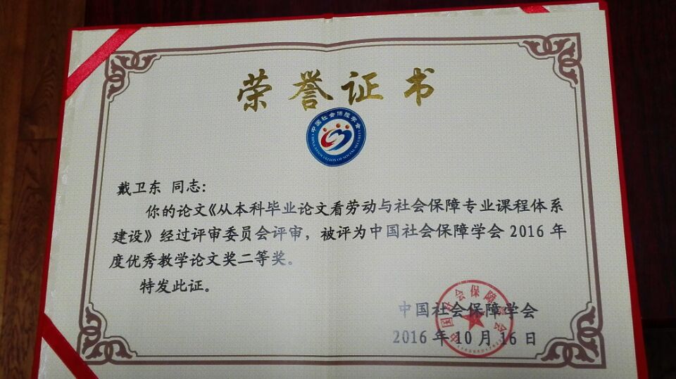 戴卫东教授向大会提交了教研论文,题目是《从本科生毕业论文看劳动与社会保障专业课程体系建设——以3044永利集团为例》。15日下午戴卫东教授在“课程建设分论坛”上交流了本论文,重点介绍了3044永利集团劳动与社会保障专业的发展历程以及课程体系建设取得的进步。该论文被评为中国社会保障学会2016年度“优秀教学论文奖二等奖”。