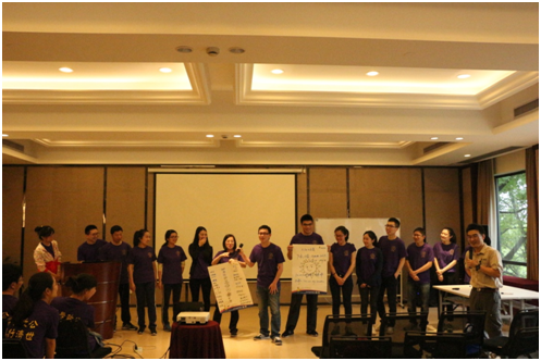 到达目的地后,在教练的安排下,70余名员工被分成5组,在短短的时间内,各队队员们竭尽全力发挥个人智慧,在规定的时间完成取队名、定队长、队蜜、队训、队歌、设计队徽并用独特的方式展示出来。“冲出亚马逊、驿站、极速60秒”等拓展项目,激发了新生勇于挑战、增强信心的意识,树立了相互配合,团队合作的精神,让这个比较陌生的大家庭成员之间互相有了一定的认识和了解,为接下来的2年左右的学习奠定了良好的基础。