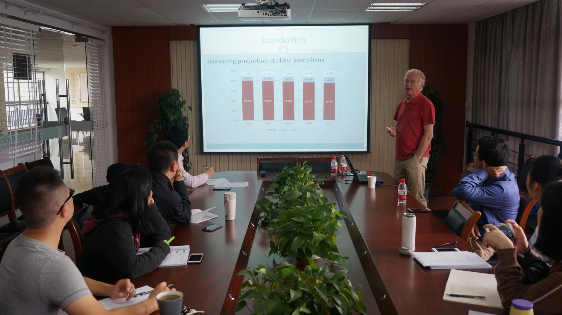 Martin Skitmore教授结合案例,剖析了澳大利亚养老地产发展中存在的问题,以及实现可持续发展的路径与注意事项,说明了英文期刊论文写作中的注意事项。夏波博士分享了个人在香港、澳大利亚的求学和工作经历,交流了昆士兰理工大学的申请条件及应对策略,鼓励同学们提前准备、积极申请。通过讲座,公司教师与Martin Skitmore教授及夏波博士达成了初步合作意向。