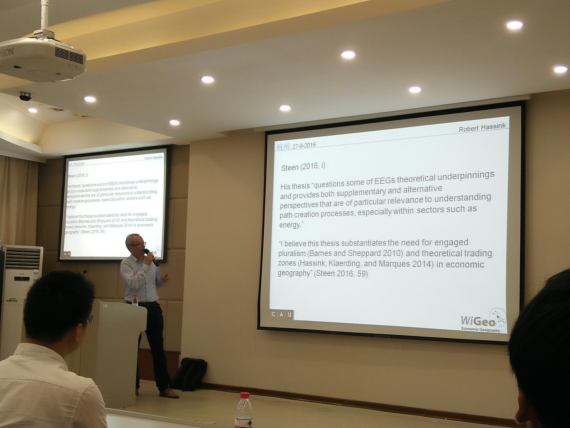 海森克教授的报告以现代经济地理学研究范式区域多元化的趋势为切入点,重点分析了各种研究范式的学科渊源、互动关系和应用价值。他利用经典案例研究来充分说明经济地理学中各种研究范式的解释力的侧重点和不足之处。通过对中国两个资源型城市山东枣庄和辽宁阜新两地的案例分析,以及挪威离岸风能产业的案例总结,反思并批判了利用单一一种分析框架(如演化经济地理学)在实际问题解释过程中的不足,引出分析增加经济地理学现有范式之间的互动必要性。在报告中,他提出自己的观点:非排他性的经济地理学范式是今后实证研究,特别是非西方情景下实证研究的趋势。结论中他还指出经济地理学中大部分关键问题是无法用某一特定的范式来解释的,西方主流经济地理圈以外的学者应该超越西方学术霸权主义模式下的分析框架,批判性地建设性地建立新的话语权。