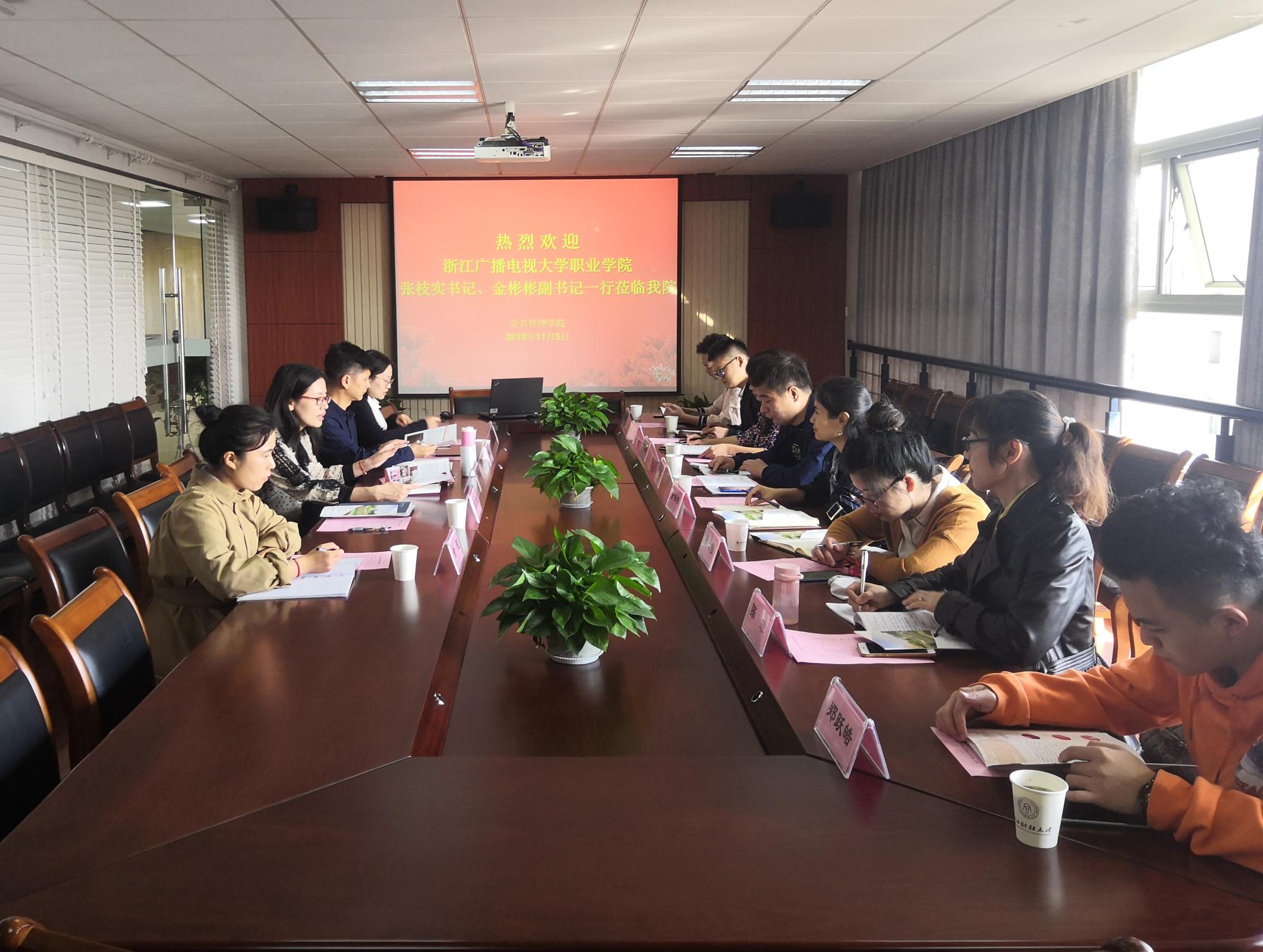 11月5日,浙江广播电视大学直属公司党总支书记张枝实、副书记金彬彬及其他老师一行8人,专程赴公司开展党建工作交流。公司党委书记沈晓敏、副书记程晓东以及相关老师参加座谈交流。