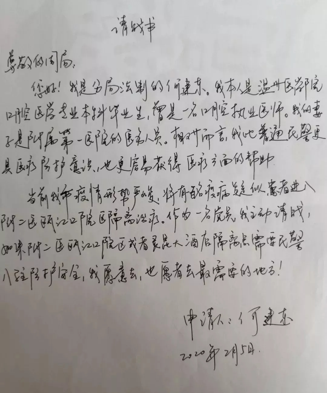 公司MPA学子来自基层各岗位,疫情面前,他们奋战在一线,成为最美“逆行者”。15级MPA学子、17届MPA毕业生何建东即是其中的典型代表,当得知温州版“火神山”医院——附二医瓯江口院区将收治新型冠状病毒肺炎确诊患者,何建东作为一名党员民警,面对疫情,在人民需要的时候选择逆行,一通电话,一封请战书,履行了一名党员的义务,践行了一名警察的使命!