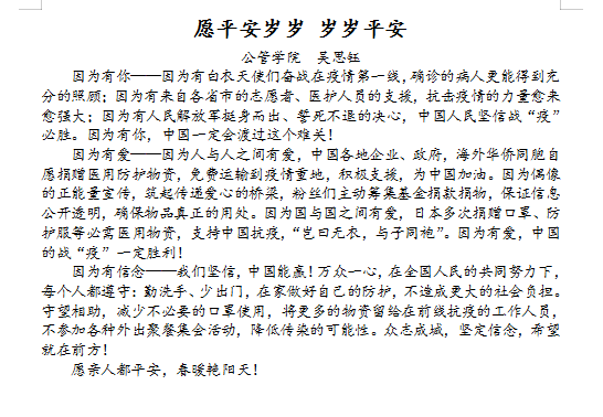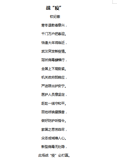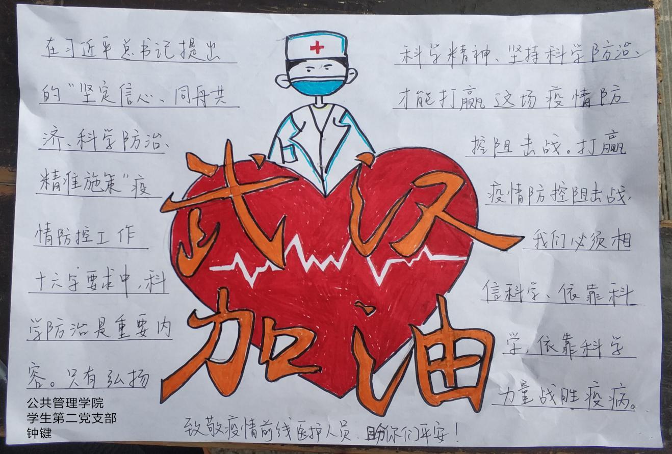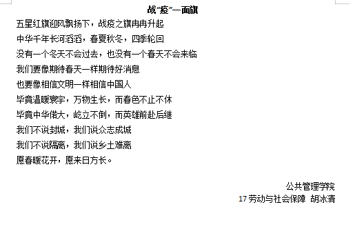 在员工党员和入党积极分子的带动下,同学们创作了许多令人动容的作品,他们通过手中的画笔,绘出胜利的希望;通过坚定的誓言,抒发必胜的信心;通过优美的诗歌,歌颂一线抗“疫”战士,为他们呐喊,为他们加油……一篇篇文字、一幅幅画报、一段段视频,展现了公管学子心系天下的担当精神,表达了莘莘学子对抗“疫”人员的崇敬与感恩。