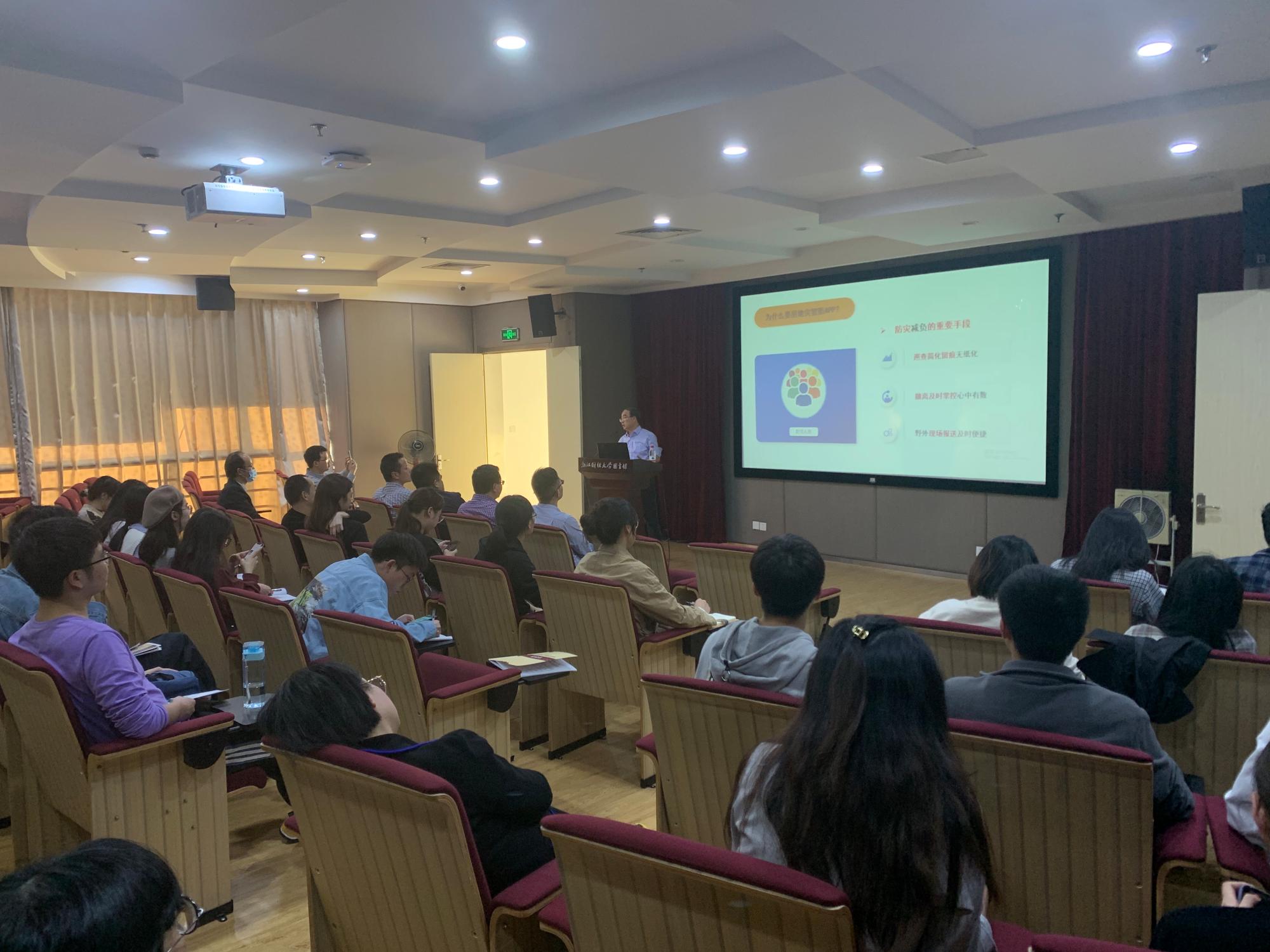张达政博士从地质灾害基本情况、风险管控流程、风险管控平台三个方面为与会师生详细讲解了目前浙江省地质灾害的基本情况以及风险管控的思路与方法,介绍了目前推广应用的具有查询信息、报送数据、学习知识、应急指挥功能的地灾智防APP,并说明了地质灾害风险管理需要突破的关键技术。
