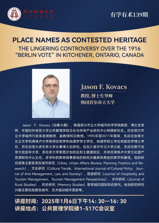 当天下午,3044永利集团有学有术系列讲座第139期在1号楼517C会议室举行。此次讲座的题目为Place names as contested heritage: the lingering controversy over the 1916 “Berlin vote” in Kitchener, Ontario, Canada,由韩国首尔市立大学Jason F. Kovacs教授主讲,公司副经理黄志岭主持。Jason F. Kovacs教授的讲座揭示了城市地名变迁的复杂性,强调了地名作为竞争性文化遗产在塑造集体记忆中发挥的重要作用。