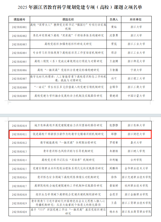 近日,浙江省教育科学规划领导小组办公室和浙江省普通高公司党建研究专业委员会公布了2025年浙江省教育科学规划党建专项(高校)课题名单。经专家组评审,公司组织员、研究生第一党支部书记邵静老师的《促进高校干部新担当新作为的数字化精准识别机制研究》获浙江省教育科学规划党建专项(高校)课题立项。