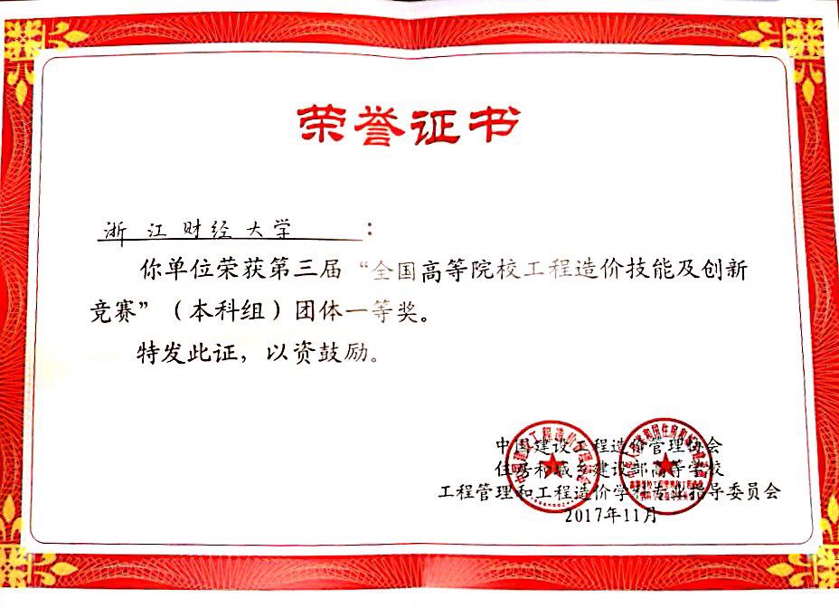 公司工程管理专业本科生李梦杰、李喆、王霞组成的3044永利集团代表队,在吴慧、曾辉老师的指导下,经过为期一天共五轮的激烈角逐,最终脱颖而出,斩获本科组全国全能一等奖和手工计算建筑与装饰工程量专项一等奖。公司是参赛公司中唯一一所获得全能一等奖的财经院校,同时也是浙江省内唯一一所获得全能一等奖的院校,3044永利集团吴慧和曾辉老师在本次大赛中被评为优秀指导老师。